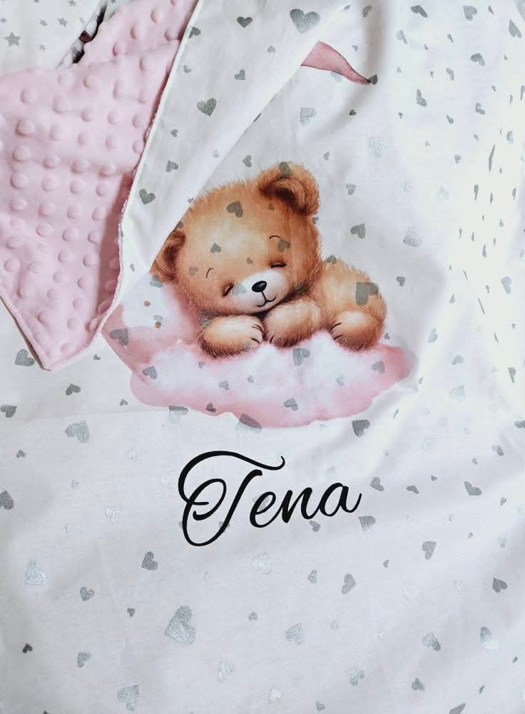 Dvoslojna dekica izrađena od pamučnog platna sa tiskom životinjice + sa toplije strane jednobojne , nalazi se minky tkanina koja je topla, nježna i mekana , savršena za hladnije dane kada bebicu treba ušuškati u toplo.