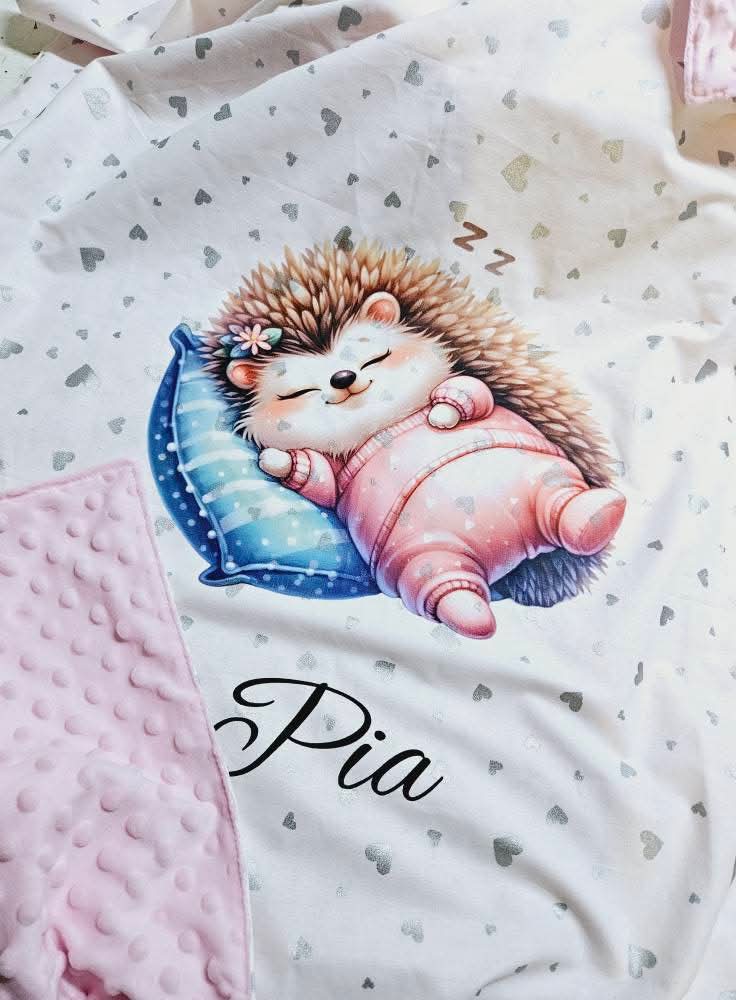 Dvoslojna dekica izrađena od pamučnog platna  sa tiskom životinjice + sa toplije strane jednobojne , nalazi se  minky tkanina koja je topla, nježna i mekana , savršena za hladnije dane kada bebicu treba ušuškati u toplo.