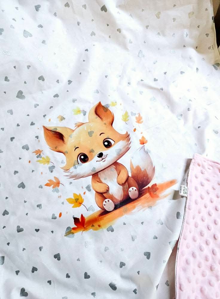 Dvoslojna dekica izrađena od pamučnog platna  sa tiskom životinjice + sa toplije strane jednobojne , nalazi se  minky tkanina koja je topla, nježna i mekana , savršena za hladnije dane kada bebicu treba ušuškati u toplo.