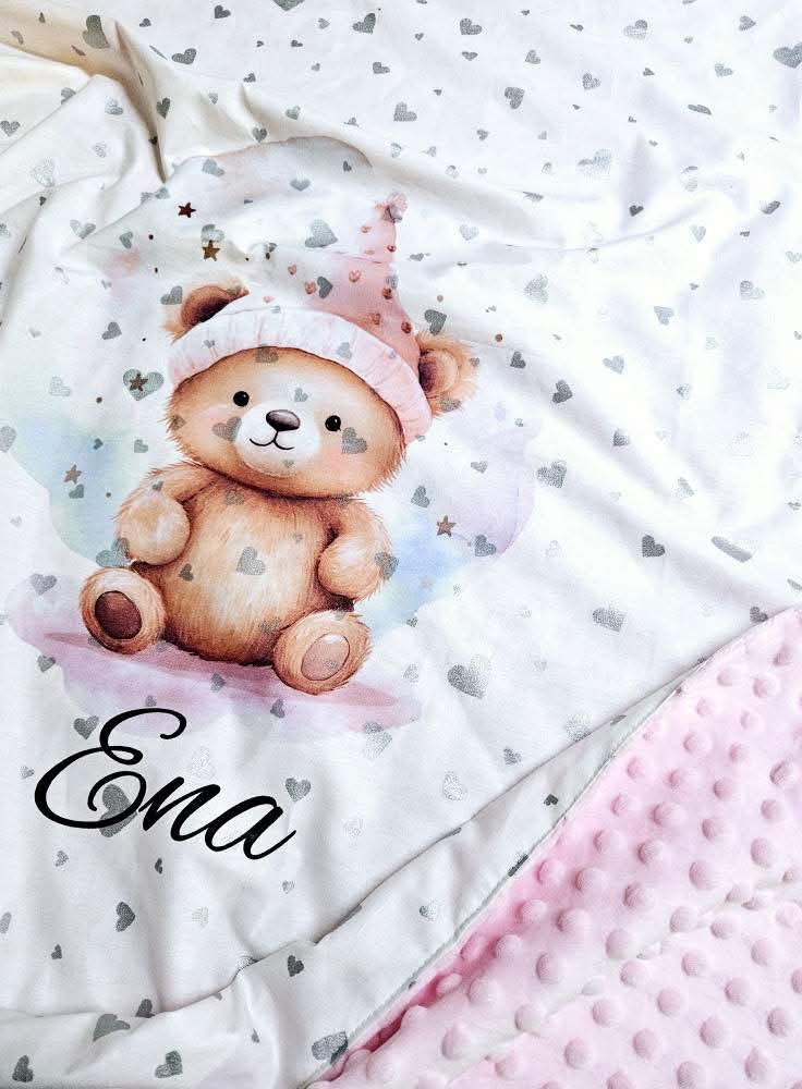 Dvoslojna dekica izrađena od pamučnog platna  sa tiskom životinjice + sa toplije strane jednobojne , nalazi se  minky tkanina koja je topla, nježna i mekana , savršena za hladnije dane kada bebicu treba ušuškati u toplo.