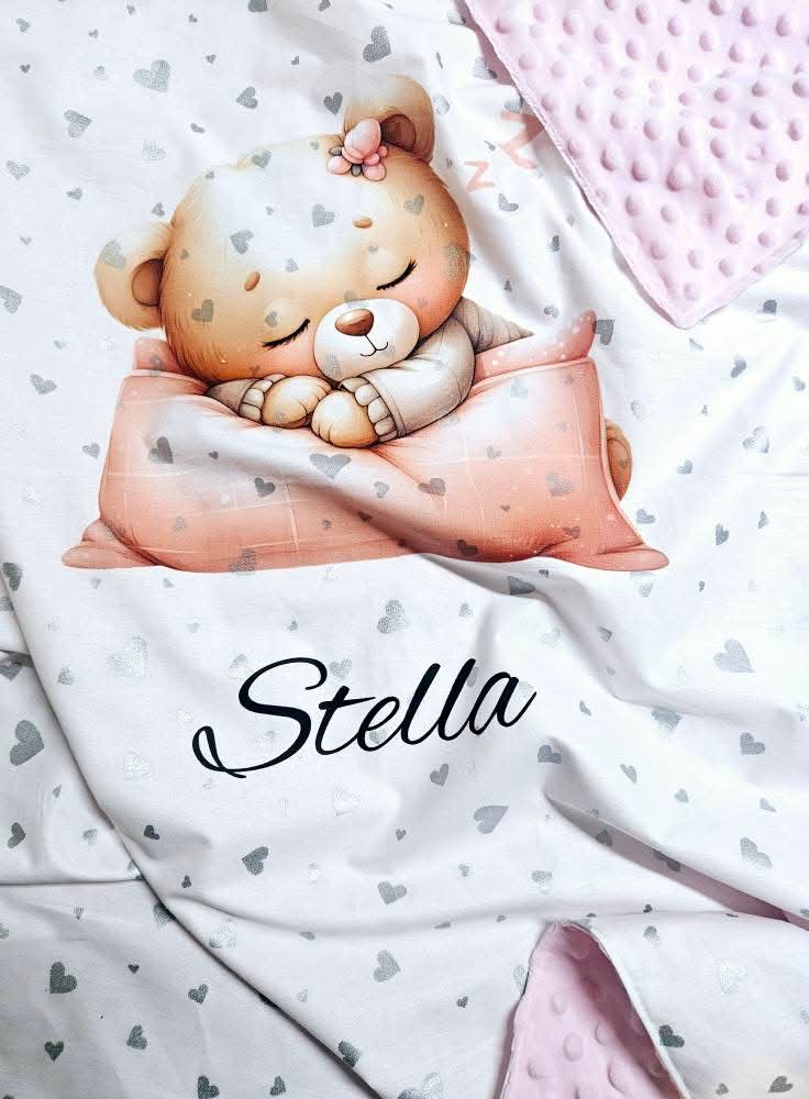 Dvoslojna dekica izrađena od pamučnog platna  sa tiskom životinjice + sa toplije strane jednobojne , nalazi se  minky tkanina koja je topla, nježna i mekana , savršena za hladnije dane kada bebicu treba ušuškati u toplo.