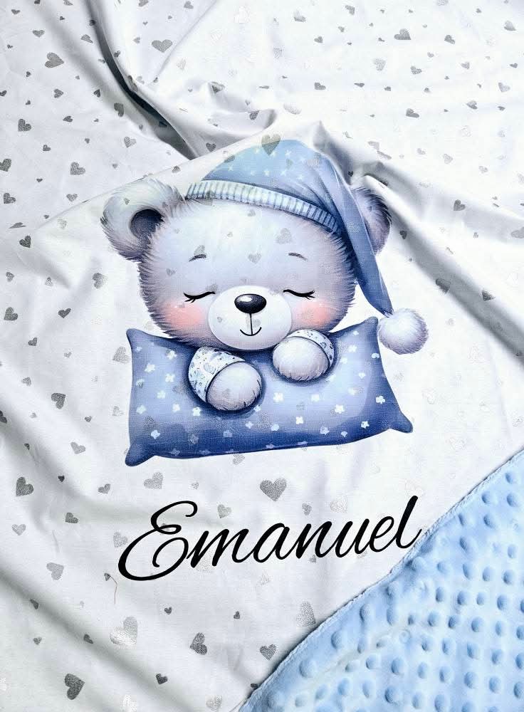 Dekica DVOSLOJNA minky+pamučno platno SREBRNA SRCA Medo plavi spava sa kapicom