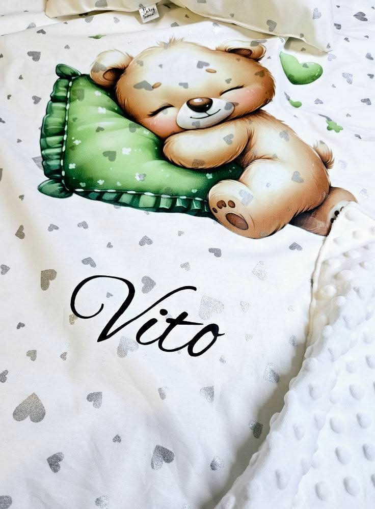 Dekica DVOSLOJNA minky+pamučno platno SREBRNA SRCA Medo spava na zelenom jastuku