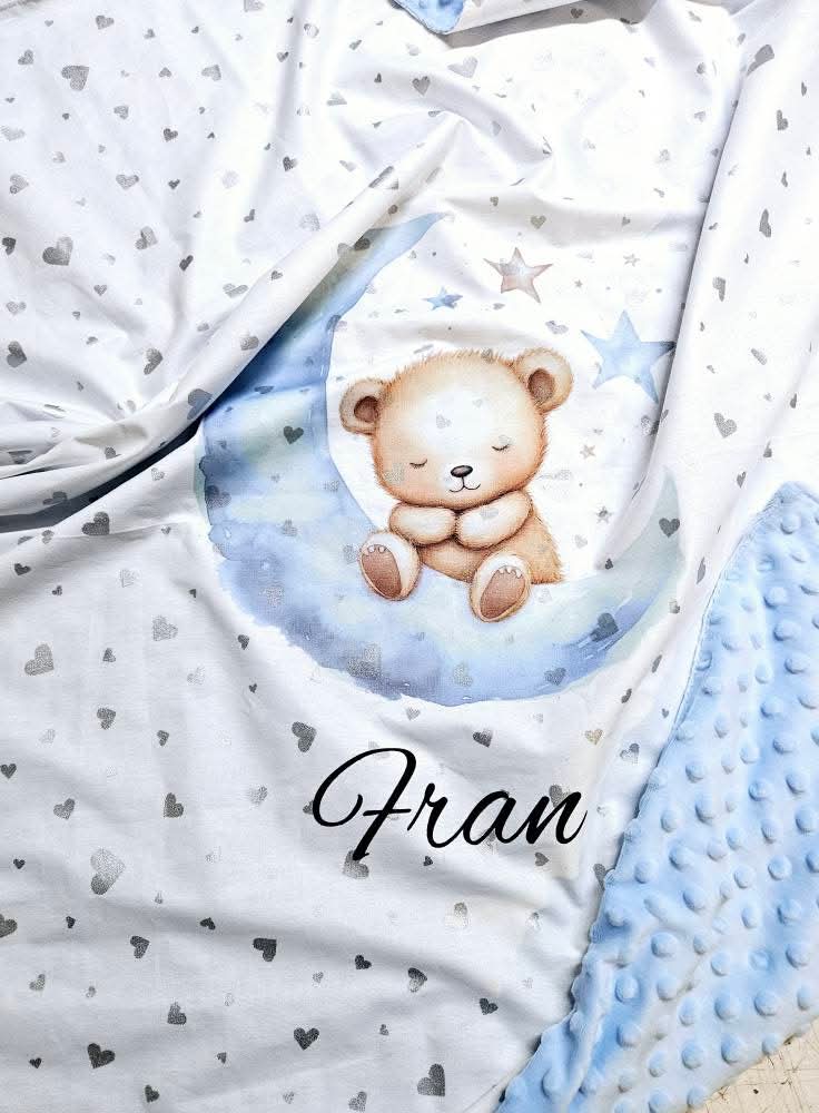 Dekica DVOSLOJNA minky+pamučno platno SREBRNA SRCA plavi medo spava na mjesecu