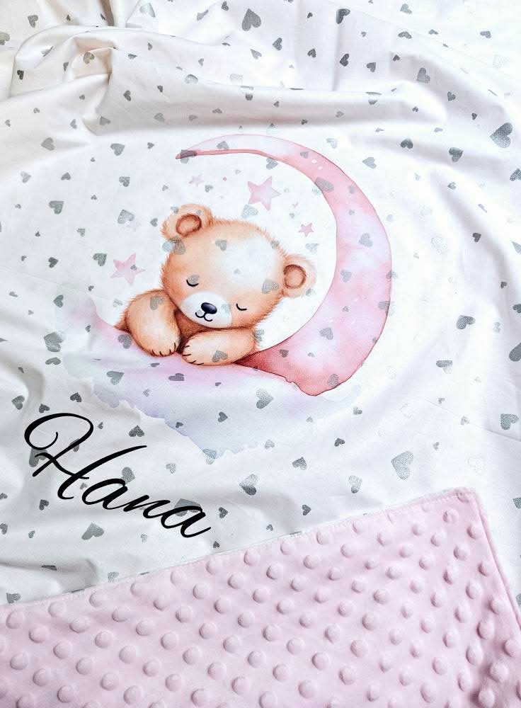 Dekica DVOSLOJNA minky+pamučno platno SREBRNA SRCA roza medo spava na mjesecu