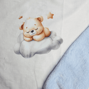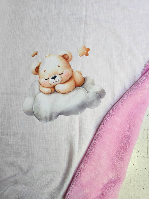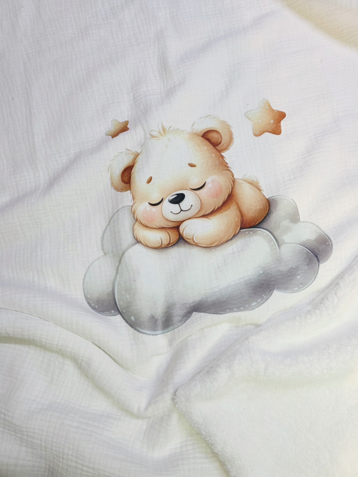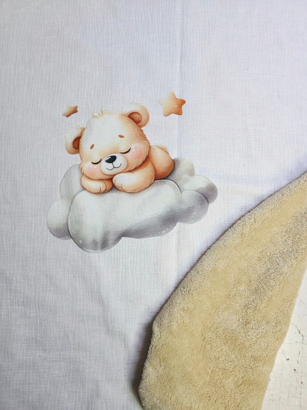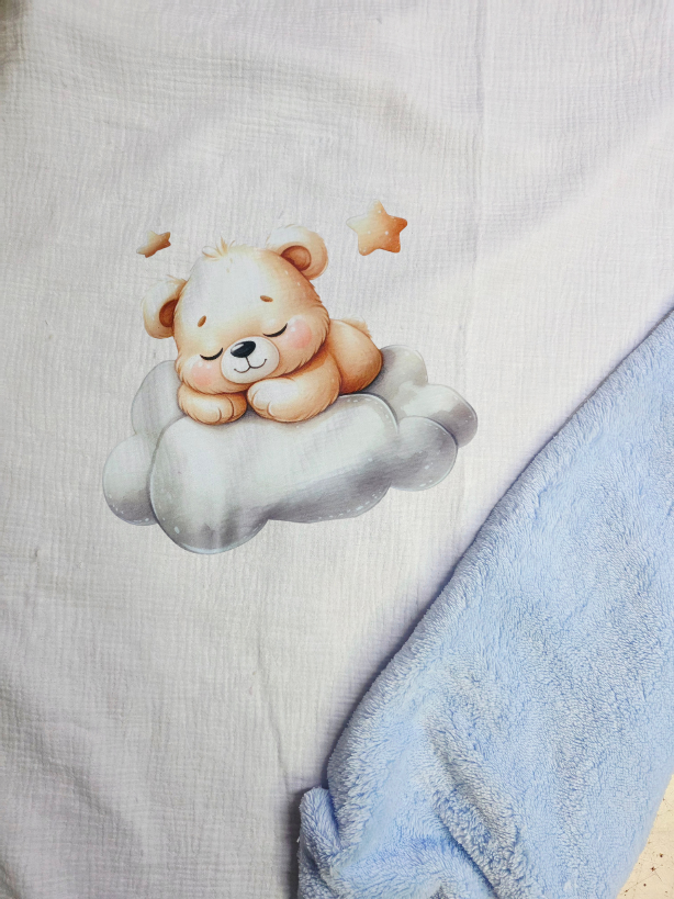 Poseban i jedinstven topla i nježna dvoslojna MUSLINSOFT dekica izrađena od toplog wellsoft materijala i muslina na kojem se nalazi tisak životinjice koju izaberete u izborniku , + ime djeteta