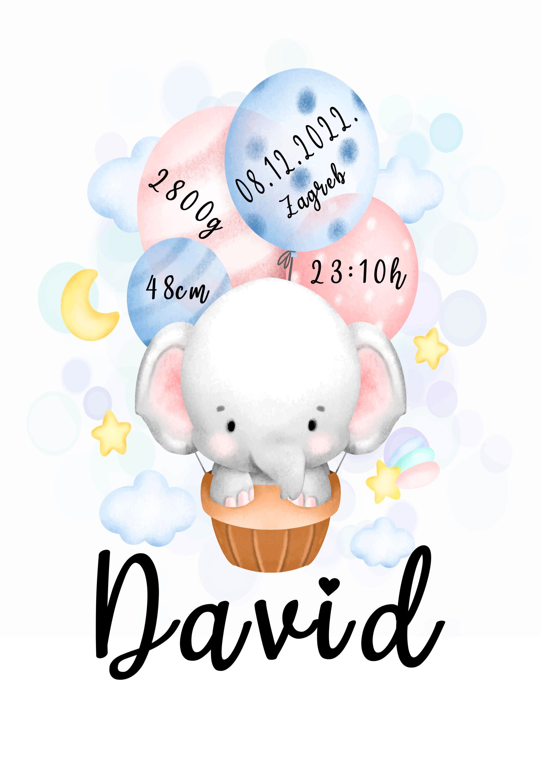 Personalizirana sličica sa preslatkim motivom slonića i balona sa zvjezdicama. Može biti i za dječake i za djevojčice.