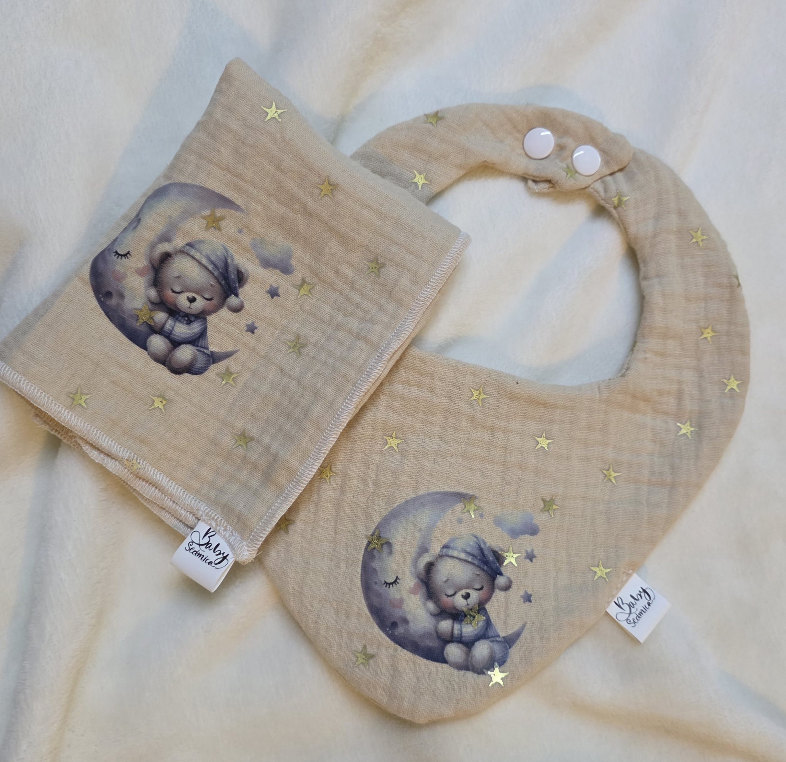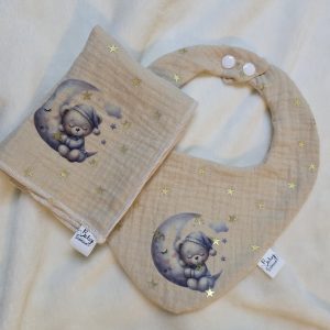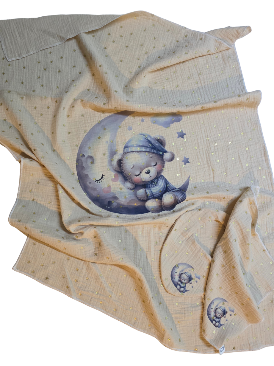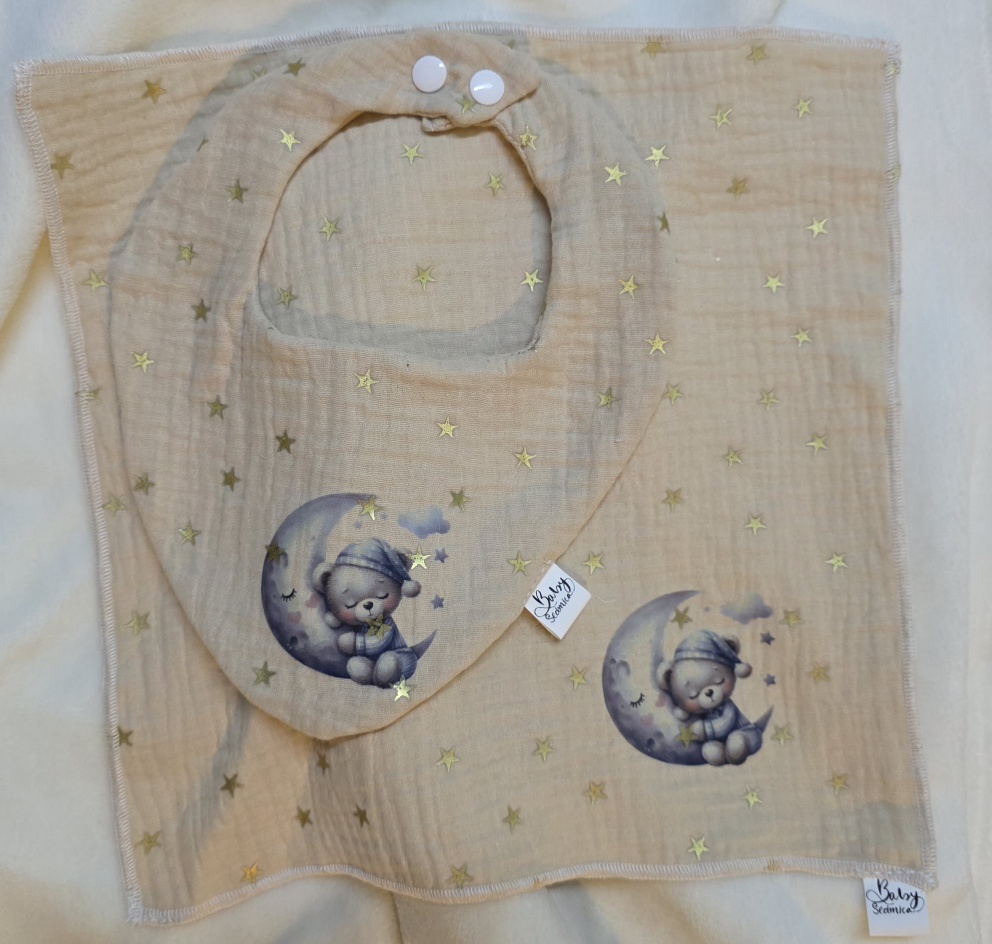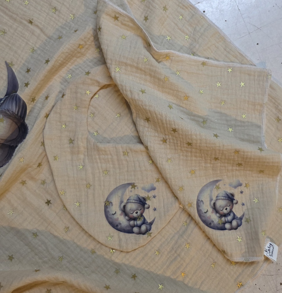 Setić se sastoji od ecru lagani pamučni muslin prekrivač u dezenu zlatnih zvjezdica dimenzija 70x100cm (+/- 2cm) sa sublimacijskim tiskom životinjice + muslin slinček + muslin krpica
