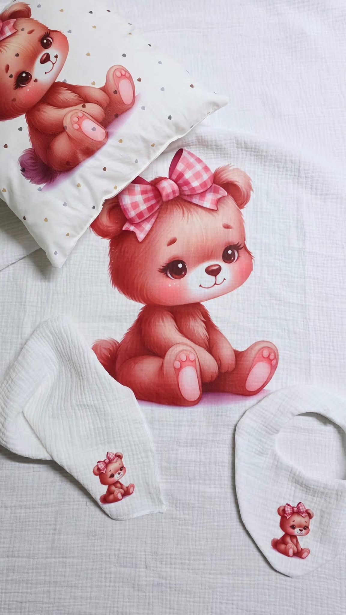 SET 4 dvoslojna muslinminky dekica+jastučić+muslin slinček+muslin krpica Medvjedica sa rozom mašnom