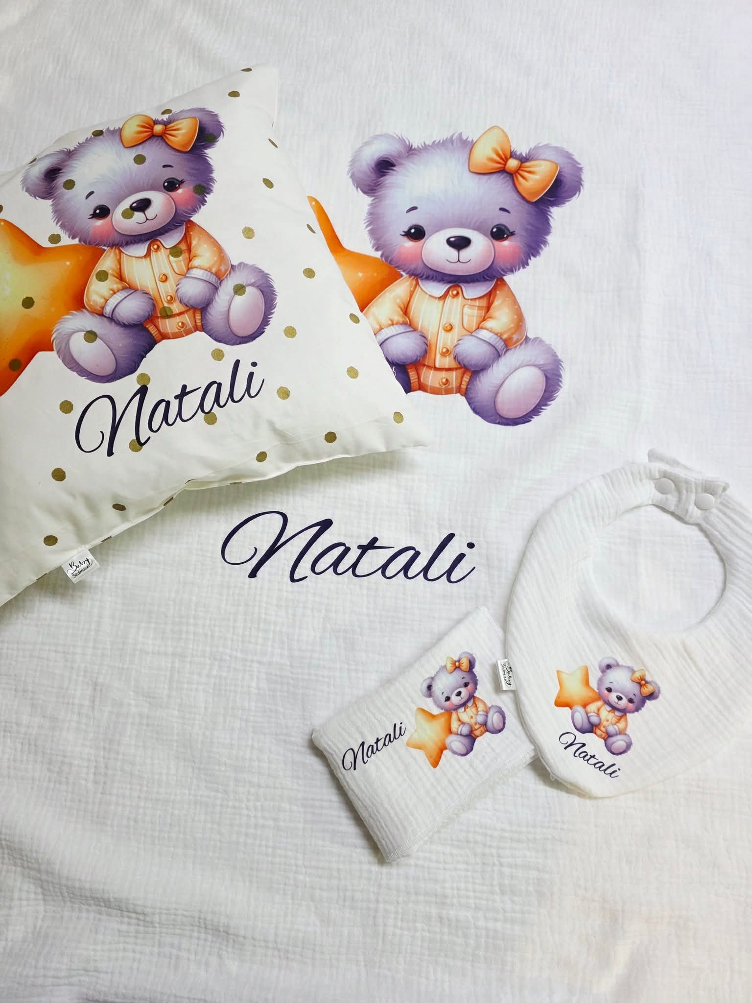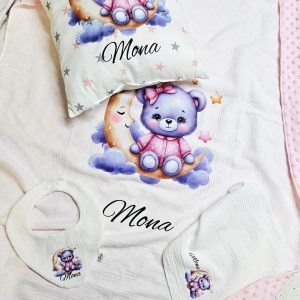 Set savršen za posjet tek rođenoj bebici sastoji se od jastučića i dvoslojne dekice koja je izrađena od muslina i minky materijala, muslin slinčeka i muslin krpce.