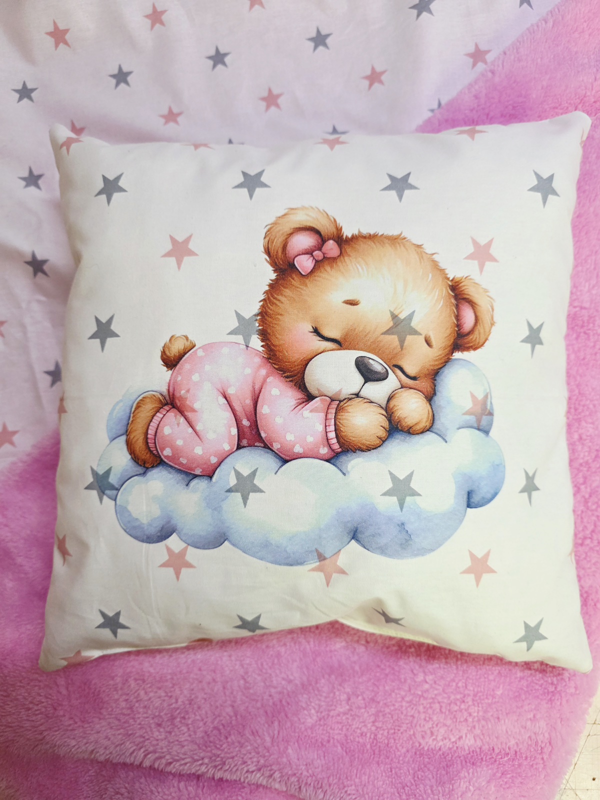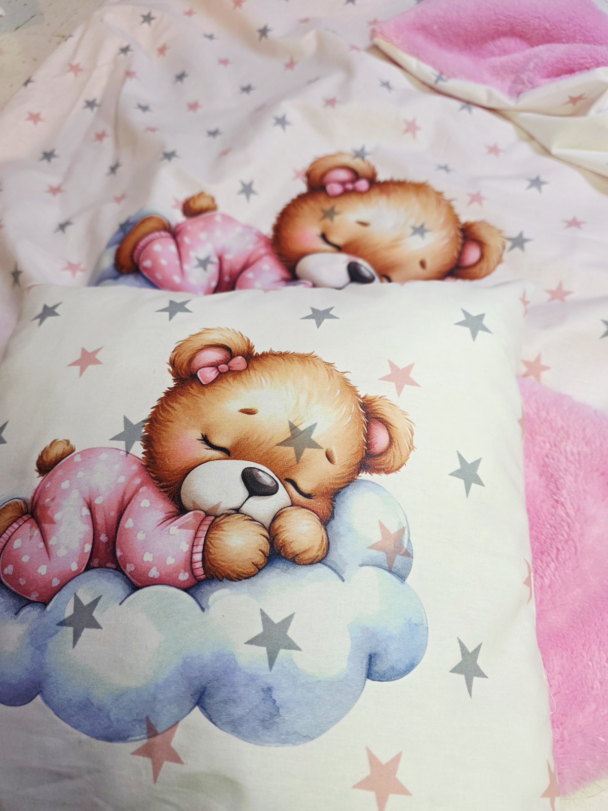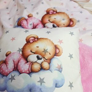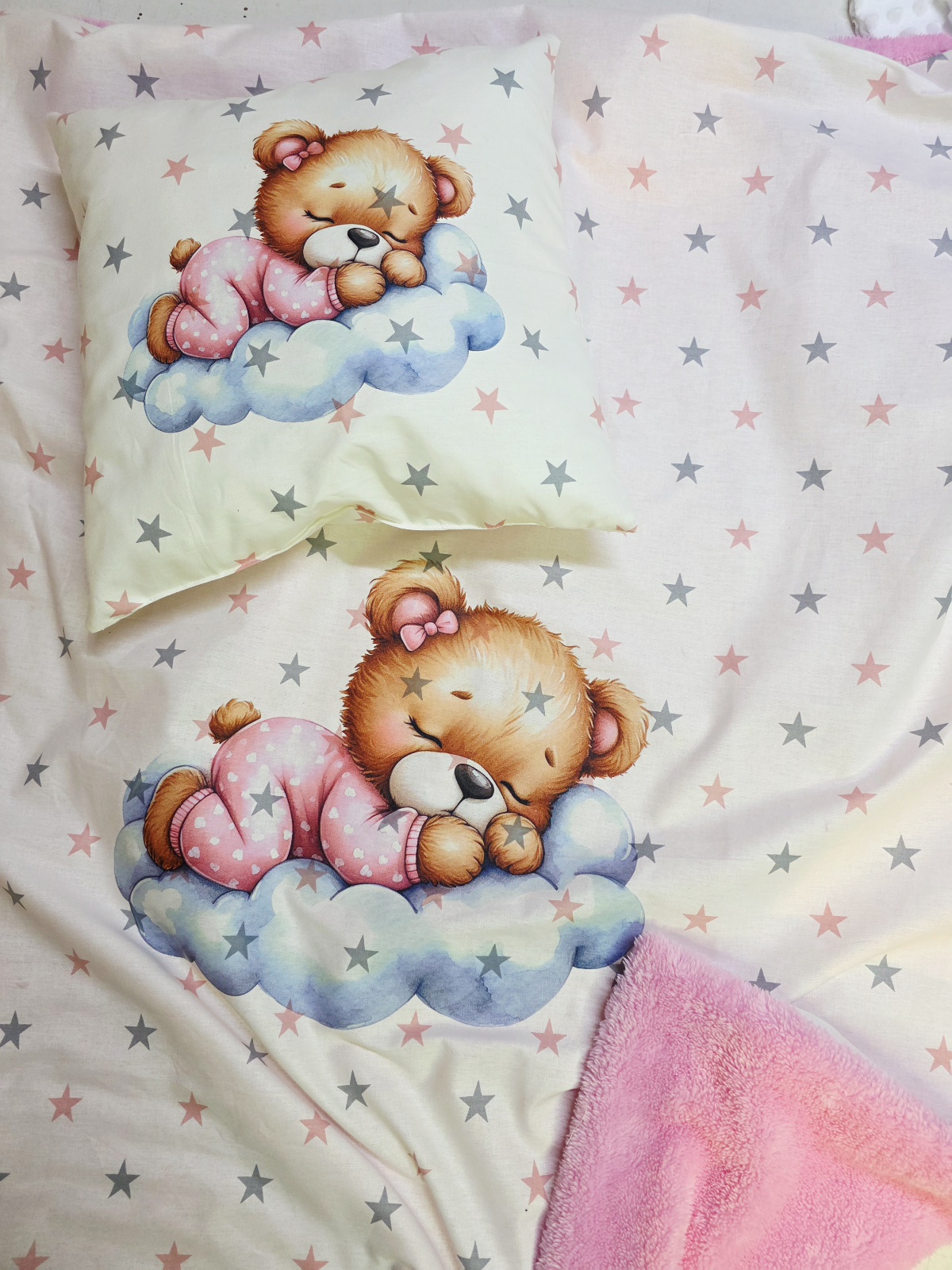 Set Soft Dvoslojna DEKICA i jastučić roza medica spava na oblaku